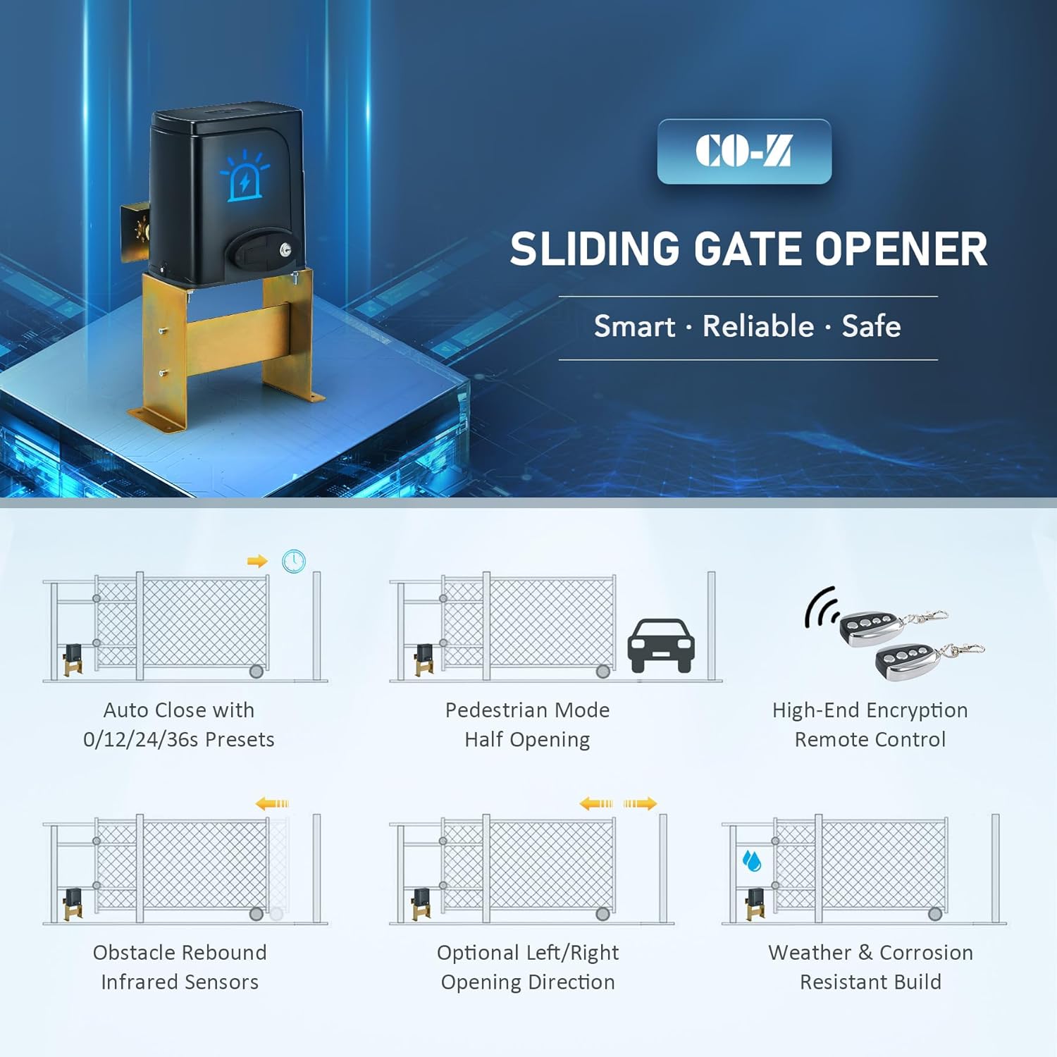 - SLIDING GATE OPENER: Featuring an energy-efficient 280W electric motor, this automatic sliding gate opener from CO-Z smoothly slides gates up to 1400 lb. and 40 ft. at 42.5 ft. per minute with the help of its quality roller chains