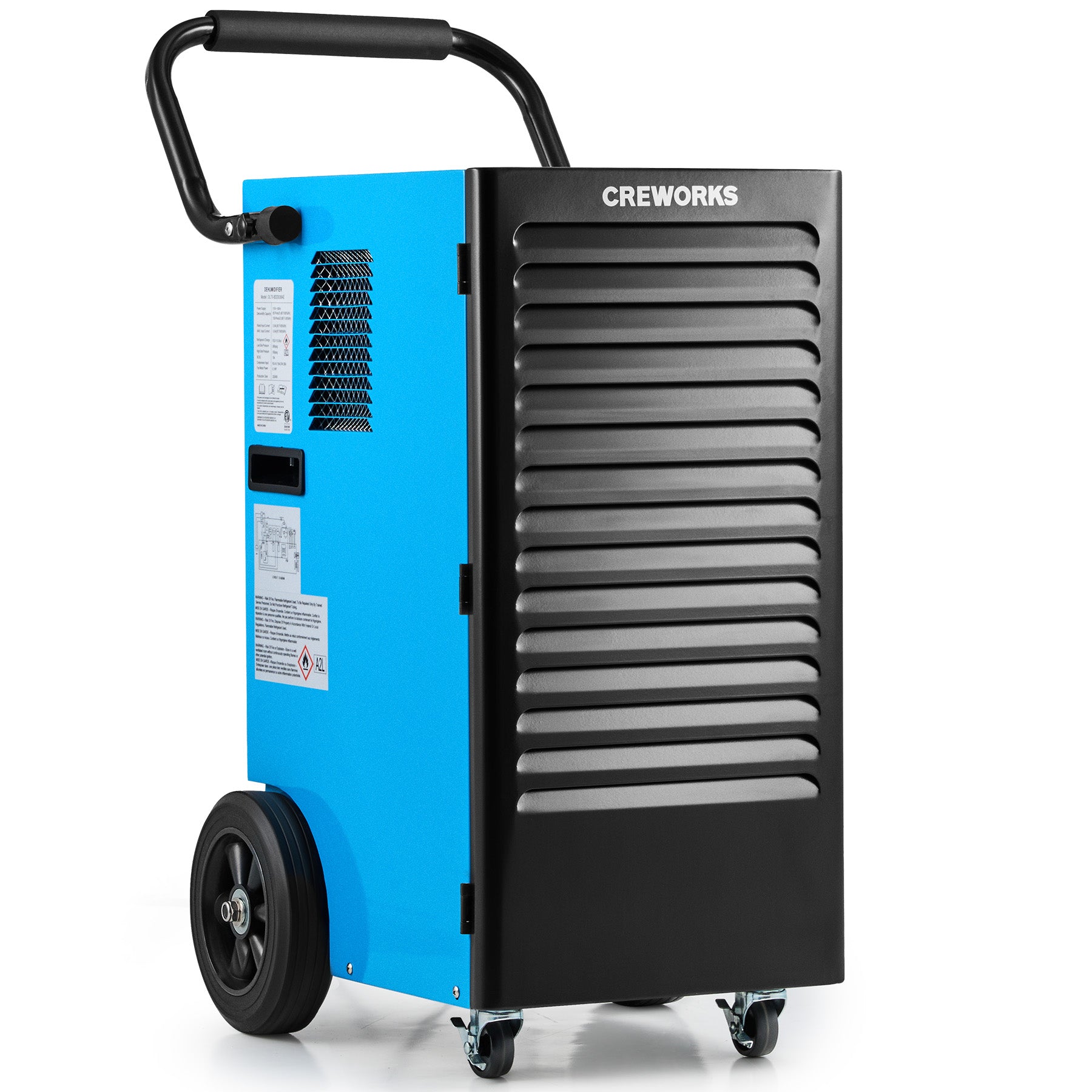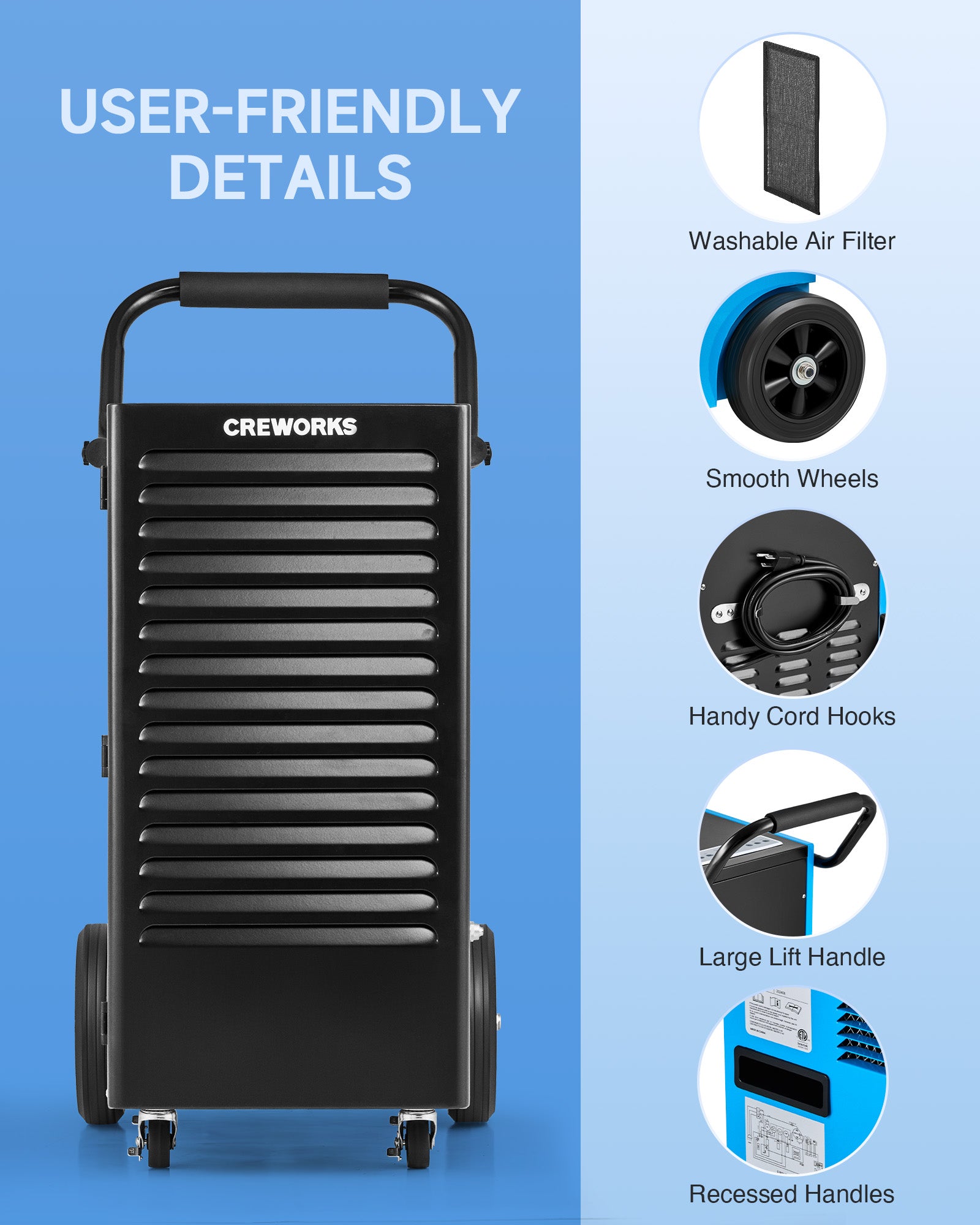 Effortlessly combat excess moisture and musty odors in large areas ranging from 600 to 1600 sq. ft. with this 180 ppd commercial dehumidifier by Creworks, ideal for factories, basements, garages, and more.