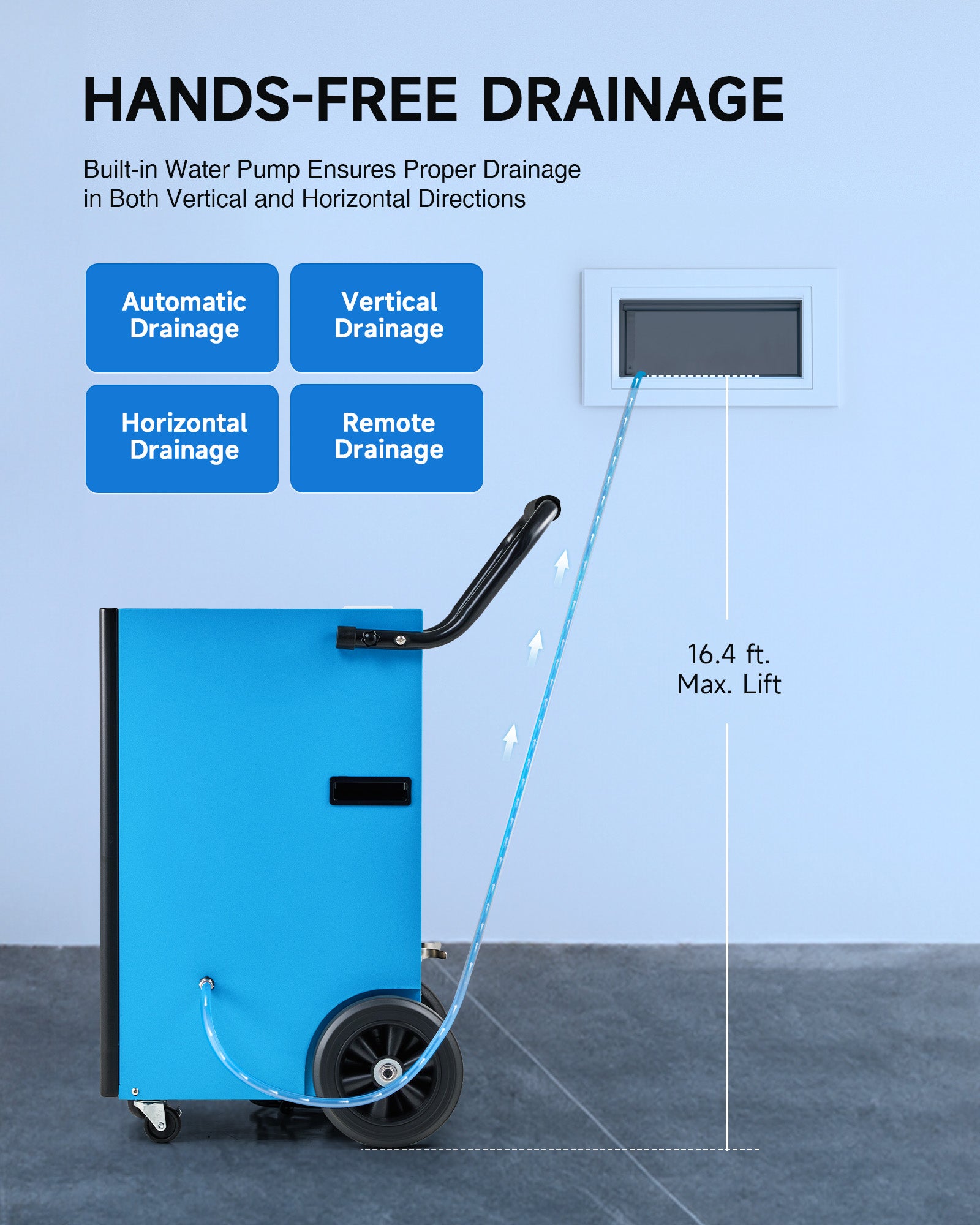 The display panel simplifies timer settings (1-24 hr.), humidity adjustments (20-90%), and water drainage control. Enjoy easy transportation of our dehumidifier for basement using the 2 large rear wheels and the convenient handle.
