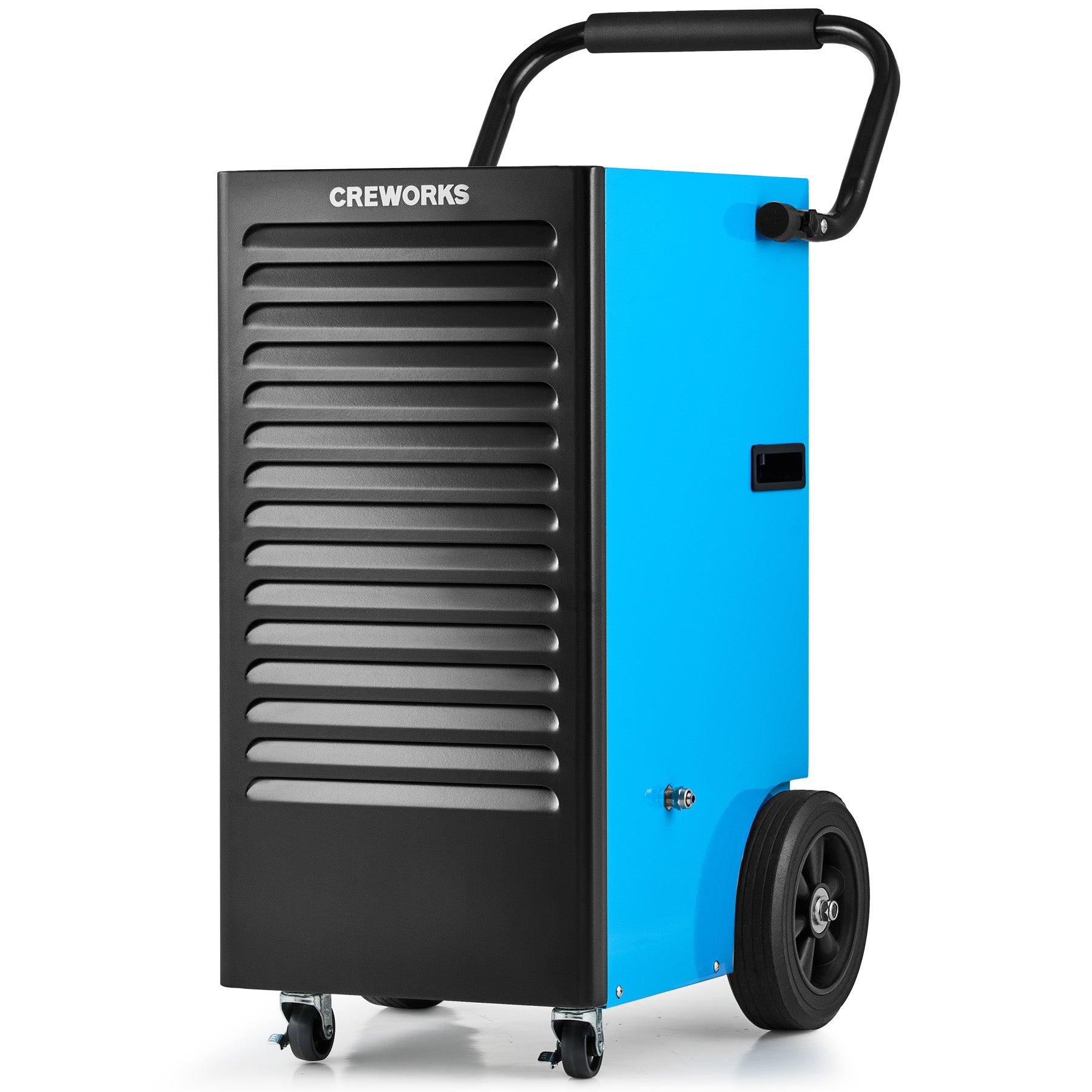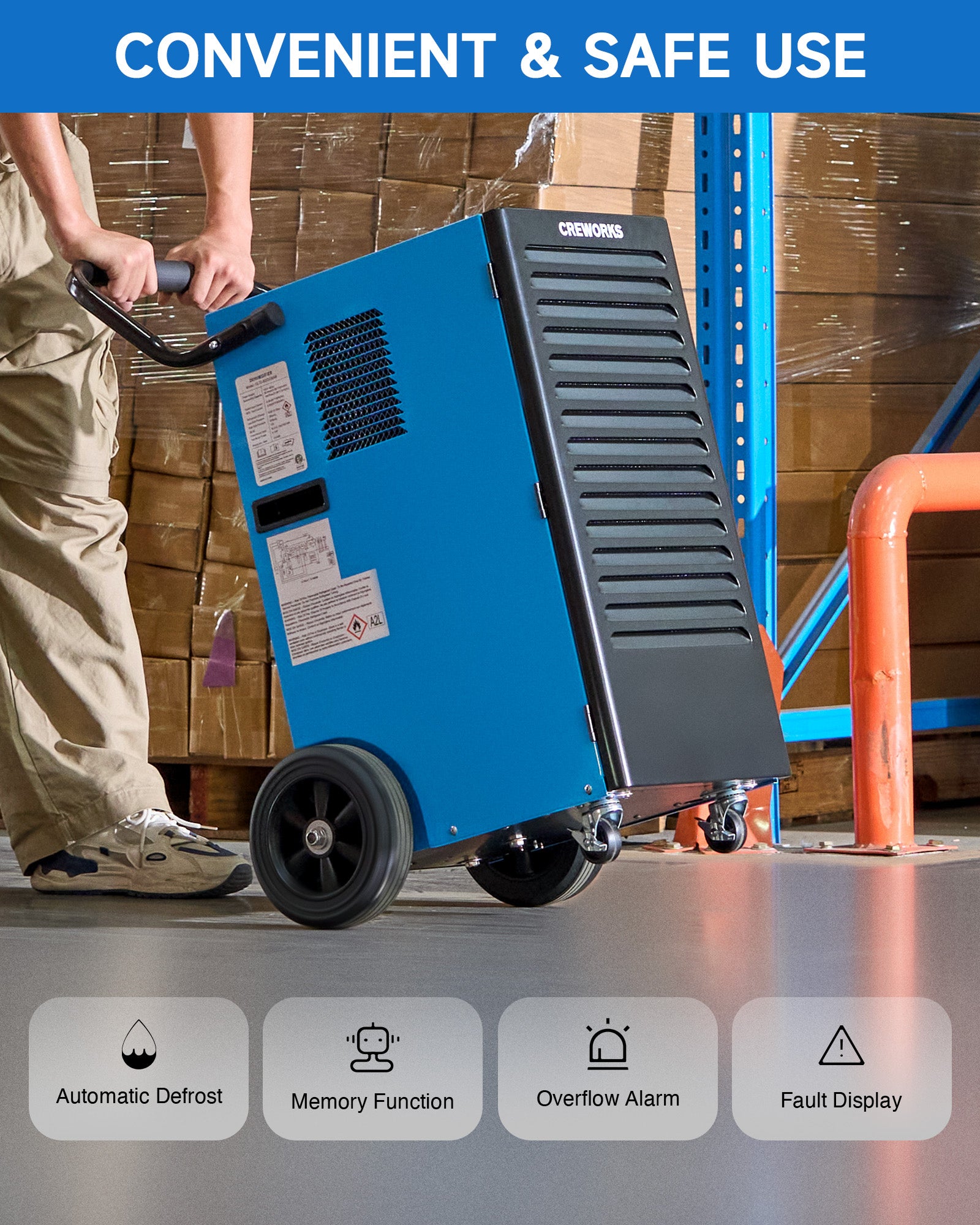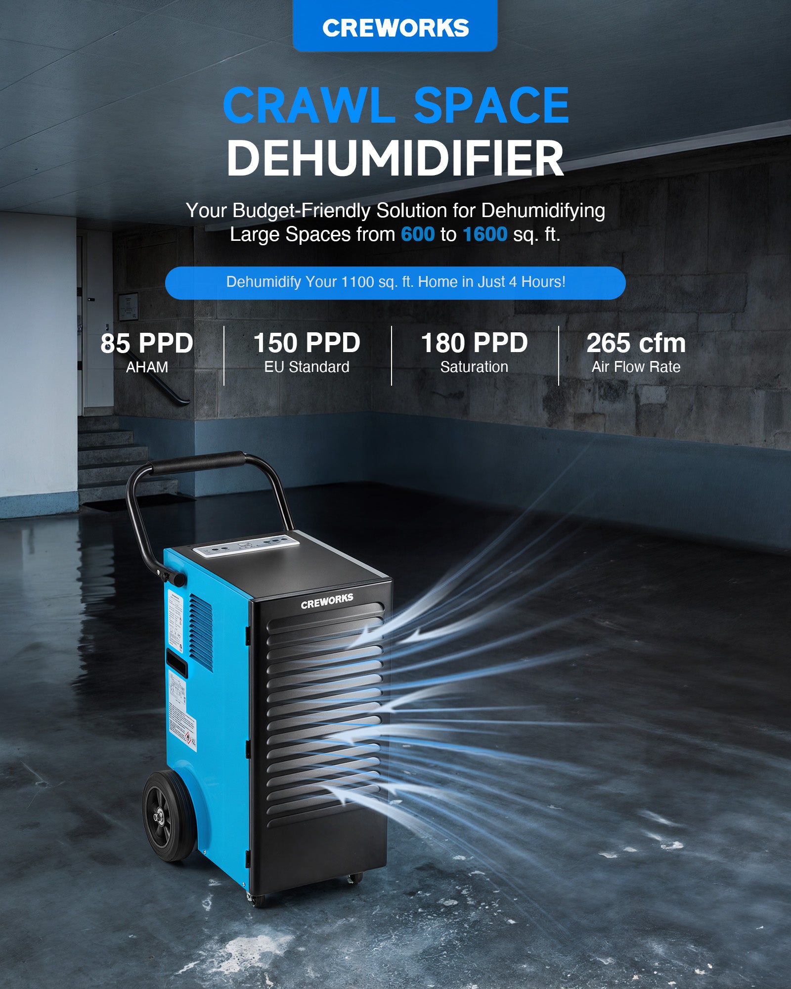 Looking for effective dehumidification in larger spaces? Creworks has the solution with its commercial dehumidifier, tailored for areas spanning from 600 to 1600 square feet. Ideal for factories, basements, garages, and warehouses, this 180 ppd large space dehumidifier swiftly eliminates excess moisture and musty odors. Featuring upgraded condenser and evaporator coils, this professional dehumidifier effectively eliminates 85 ppd at AHAM and an impressive 180 ppd at saturation, maintaining a reliably dry environment. The built-in drain pump and 16.4 ft. hose allow this under house dehumidifier to automatically drain water up to 16.4 ft. away in any direction. The intuitive display panel ensures easy adjustment of the timer, humidity levels, and water drainage. Place your order today and finally eliminate unpleasant odors, unhealthy mold, microbes, and uncomfortable dampness with this efficient room dehumidifier!
