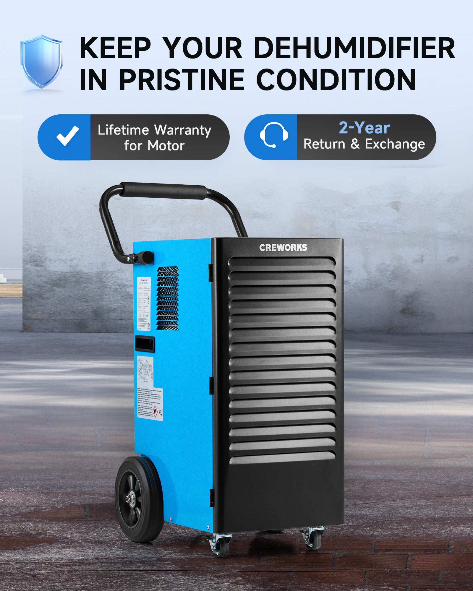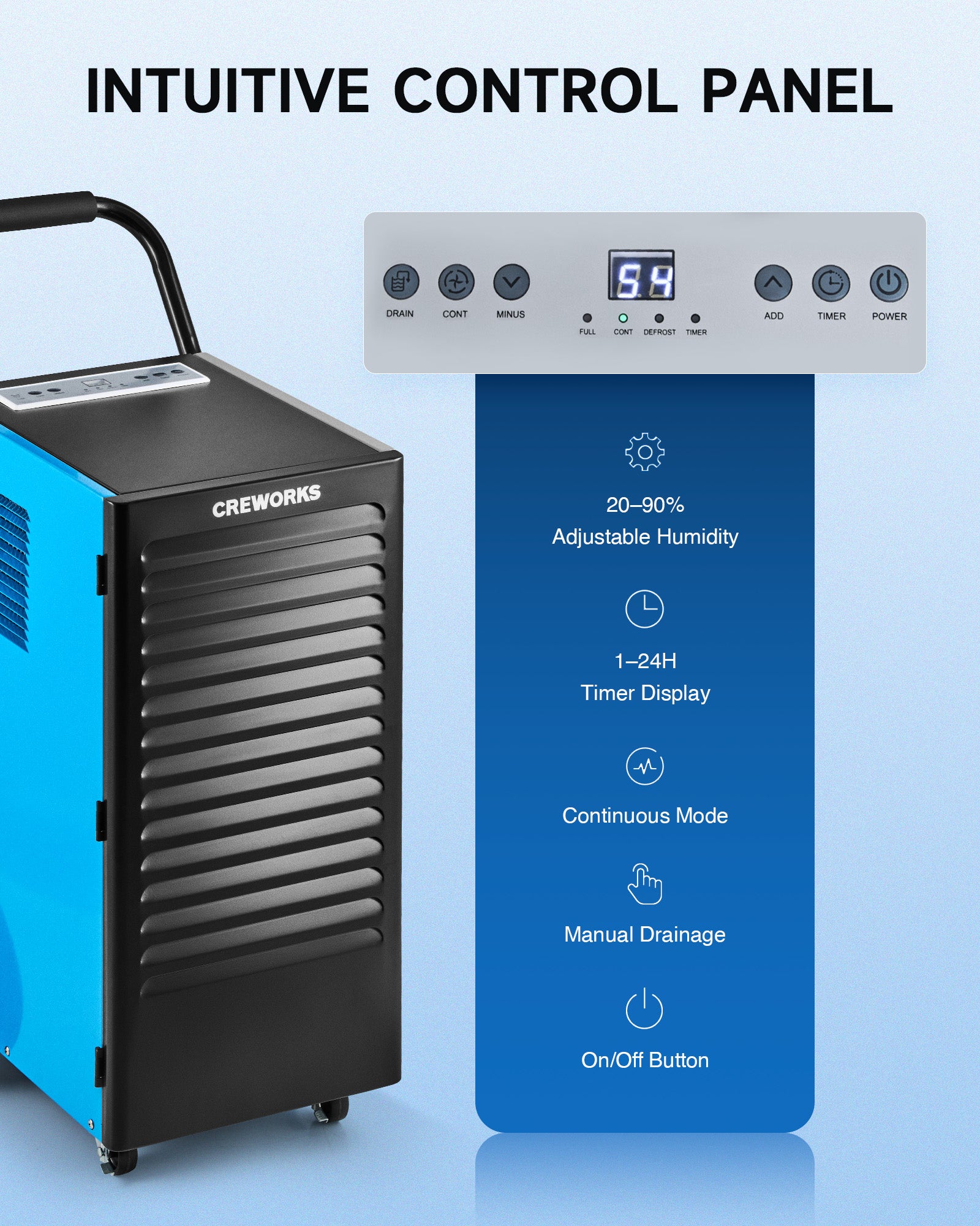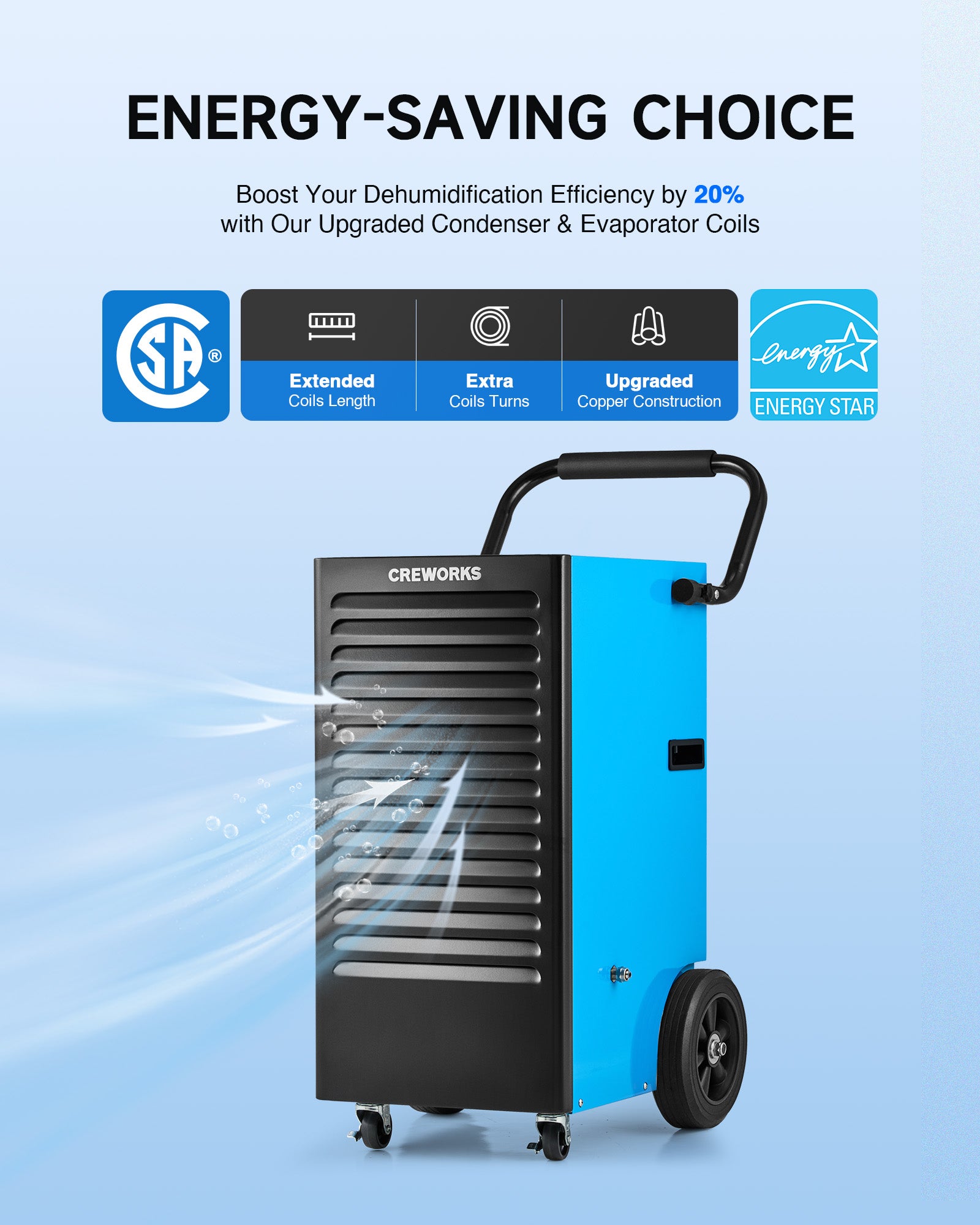 Looking for effective dehumidification in larger spaces? Creworks has the solution with its commercial dehumidifier, tailored for areas spanning from 600 to 1600 square feet. Ideal for factories, basements, garages, and warehouses, this 180 ppd large space dehumidifier swiftly eliminates excess moisture and musty odors. Featuring upgraded condenser and evaporator coils, this professional dehumidifier effectively eliminates 85 ppd at AHAM and an impressive 180 ppd at saturation, maintaining a reliably dry environment. The built-in drain pump and 16.4 ft. hose allow this under house dehumidifier to automatically drain water up to 16.4 ft. away in any direction. The intuitive display panel ensures easy adjustment of the timer, humidity levels, and water drainage. Place your order today and finally eliminate unpleasant odors, unhealthy mold, microbes, and uncomfortable dampness with this efficient room dehumidifier!