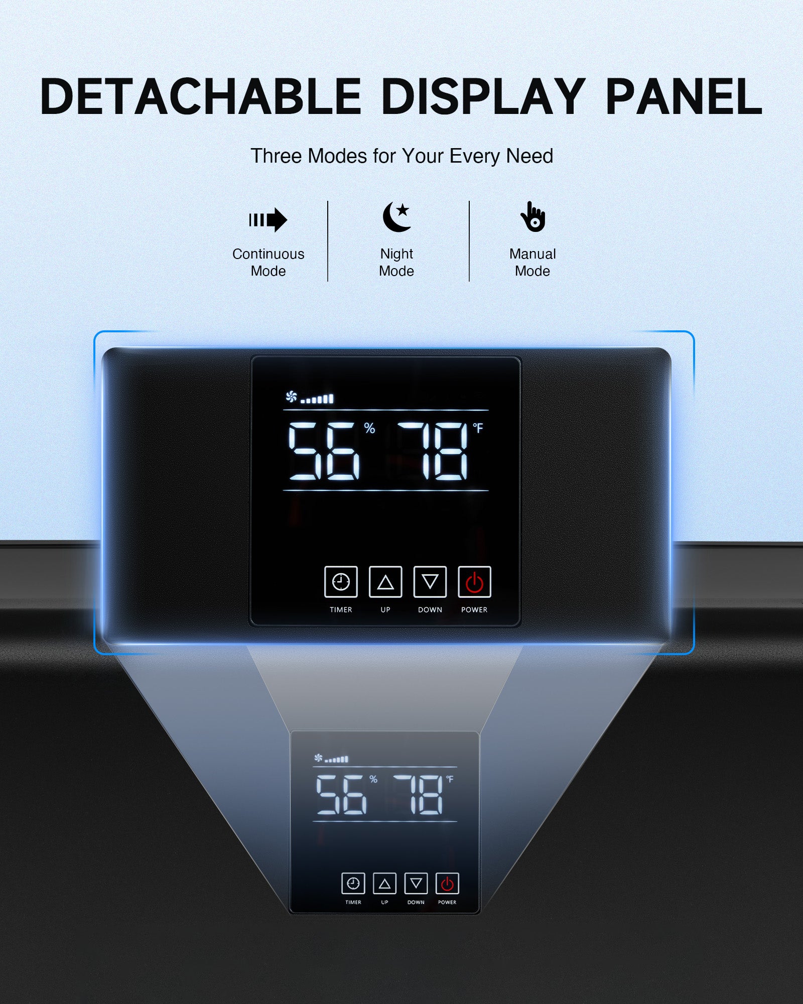 - Detachable Display Panel: Our intuitive display panel makes it easy to set the timer (1-24 hr.) and control humidity (10-98%). For convenient crawl space positioning, detach and place it anywhere within 32.8 ft. of your dehumidifier