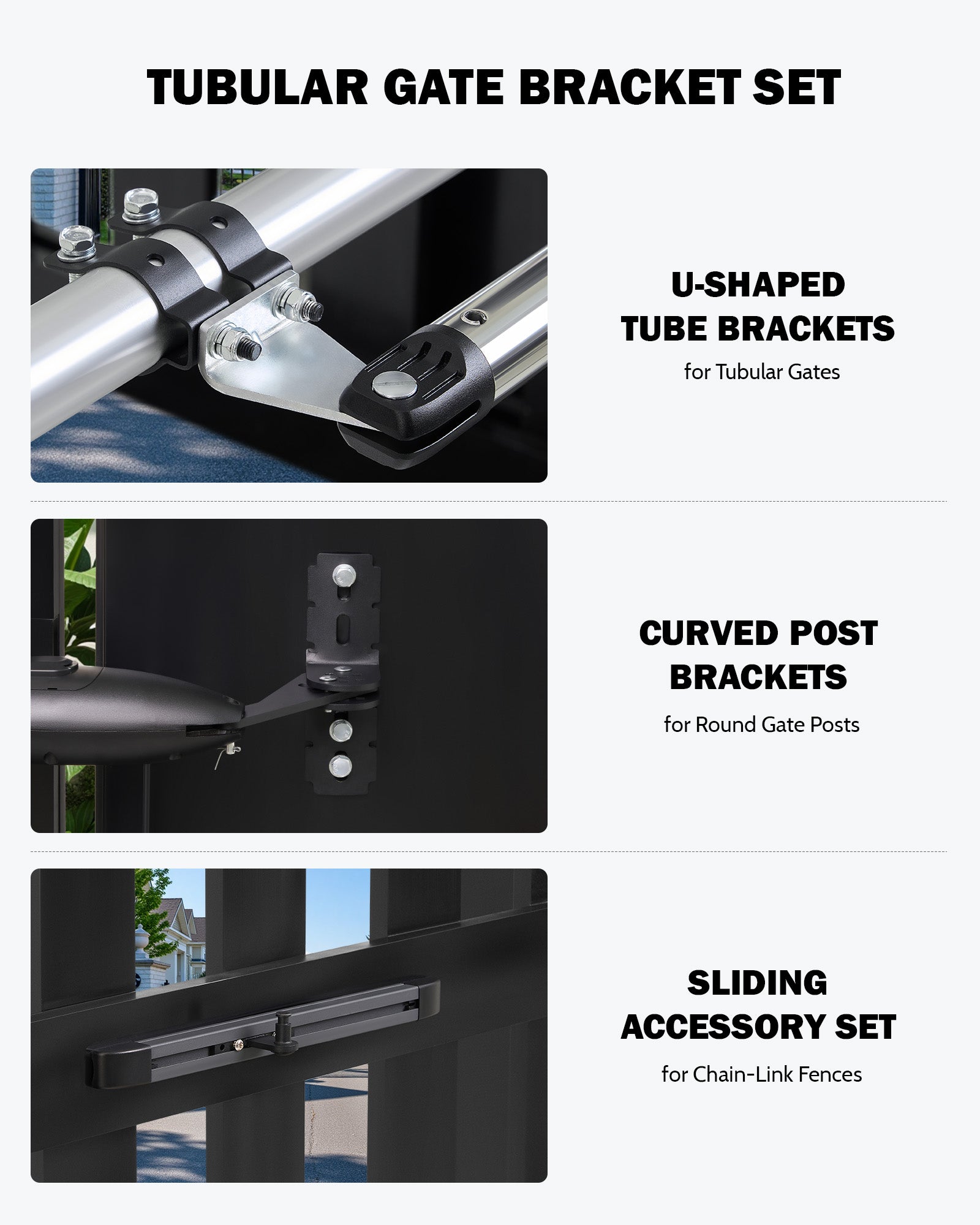 Complete Mounting Solution: This tube gate bracket kit includes U-shaped tube brackets for tubular gates, curved post brackets for round gate posts, and a sliding accessory set for easy installation on chain-link fences