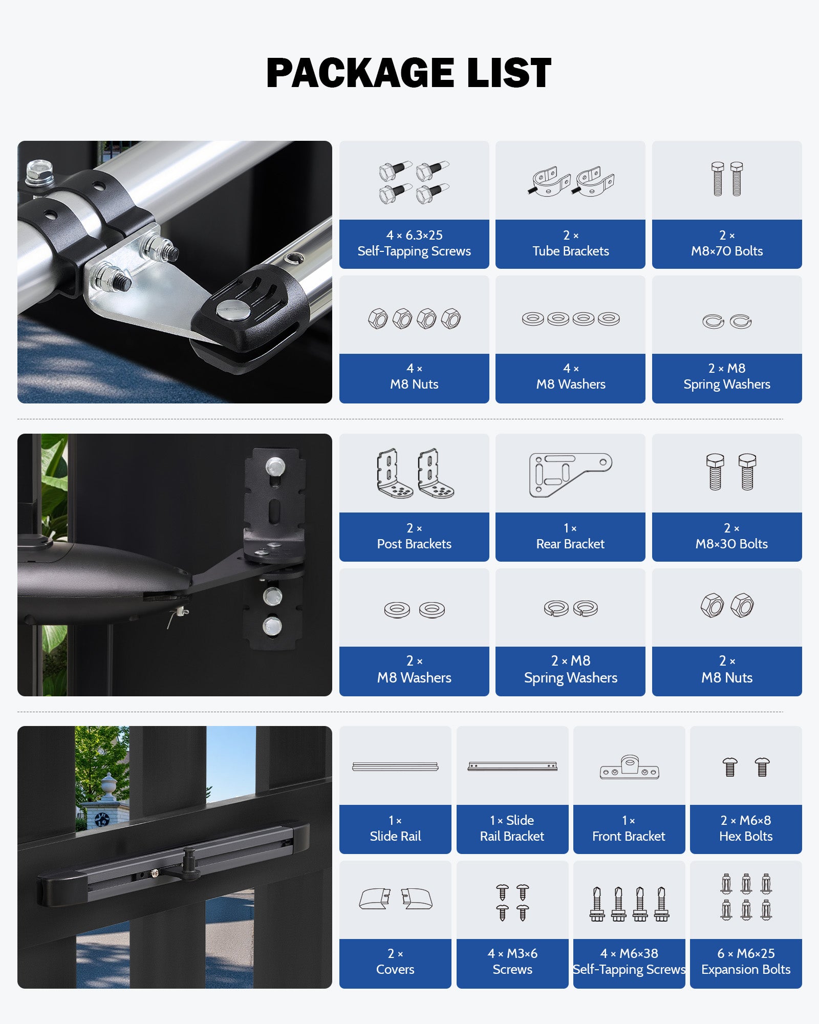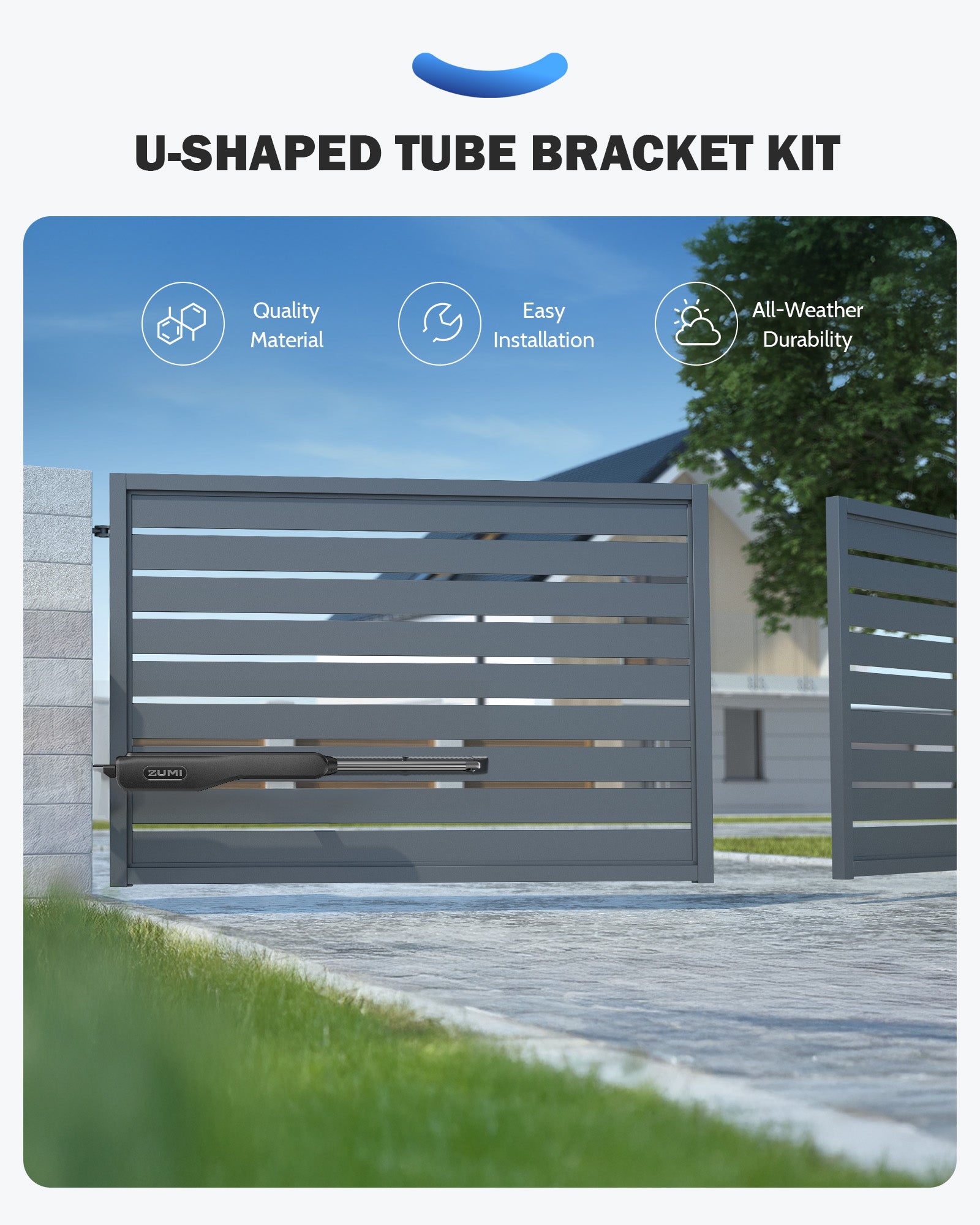 Upgrade Your Pipe Gates: Zumi's tubular gate bracket kit includes a comprehensive set of curved post bracket, U-shaped tube bracket, sliding accessory, and all necessary hardware for secure pipe gate mounting, ensuring compatibility with your gate opener