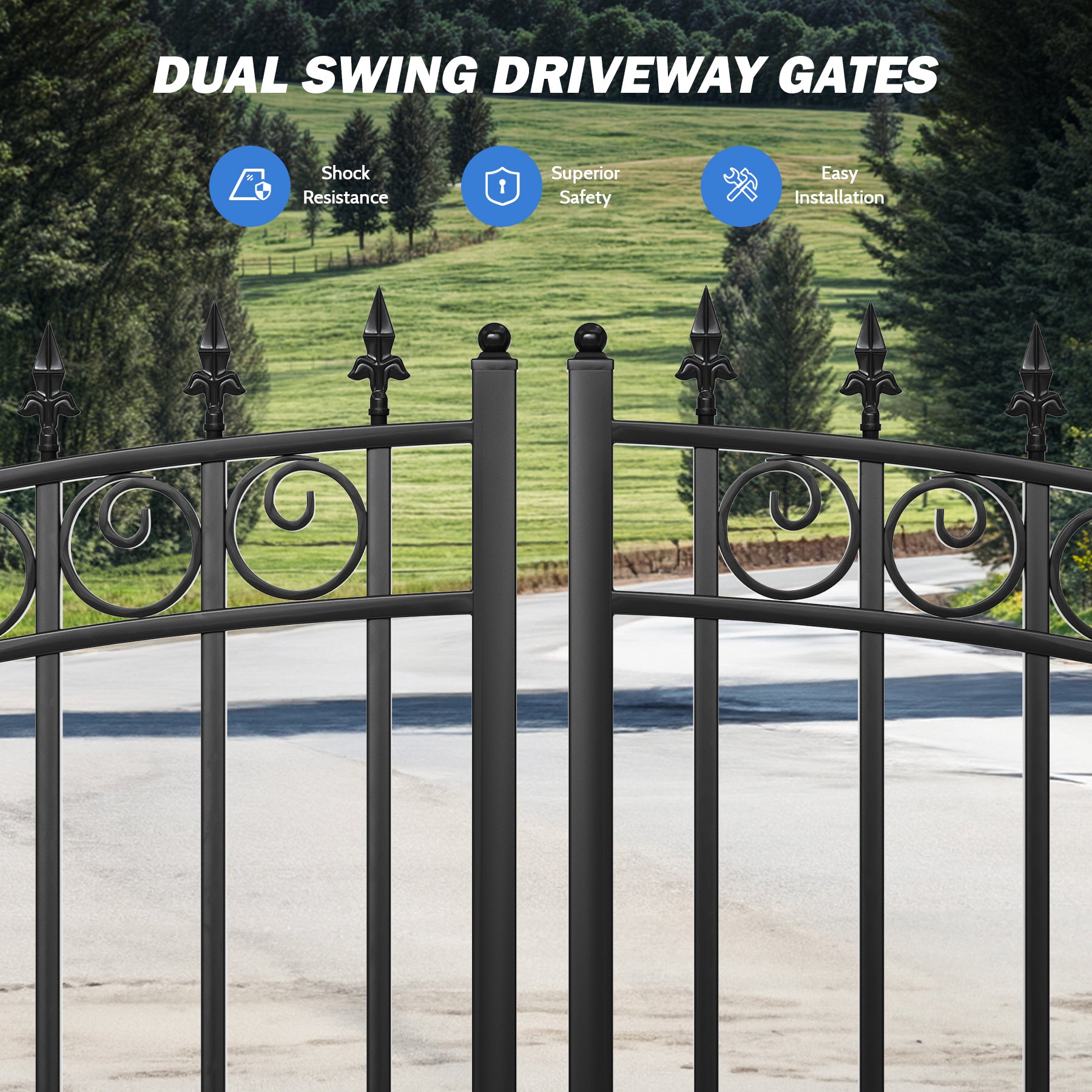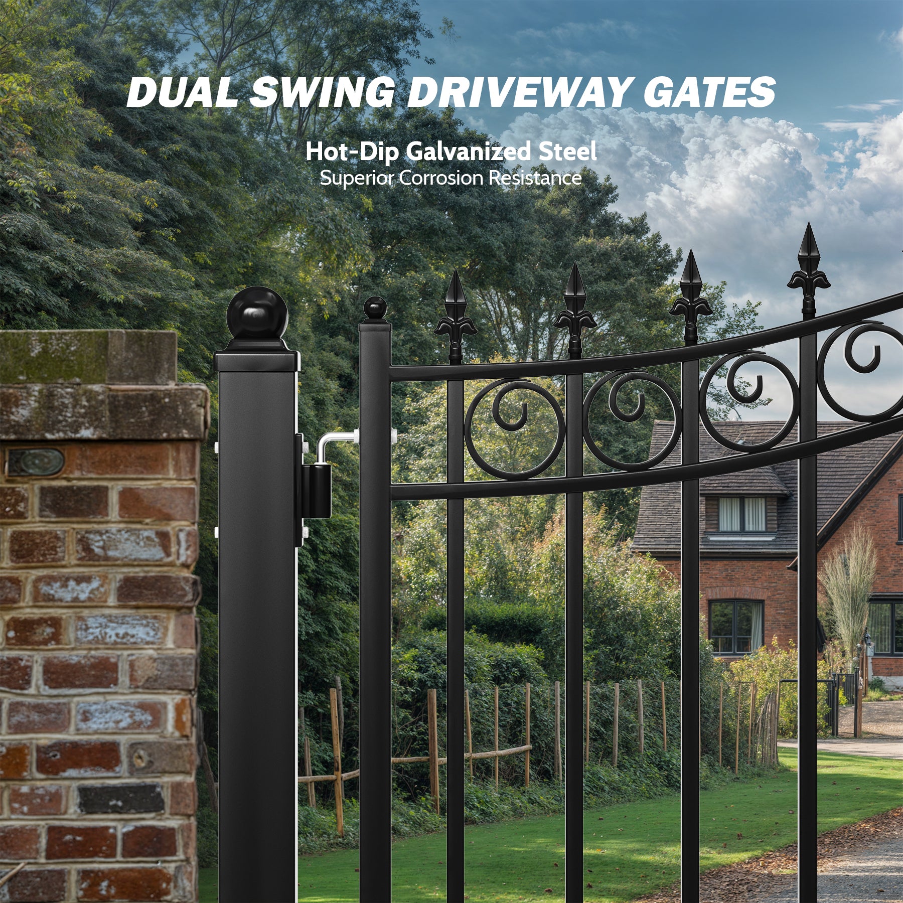• Durable Construction: Built with hot-dip galvanized steel and a corrosion resistant coating, these driveway gates are designed to endure harsh weather conditions and stand the test of time