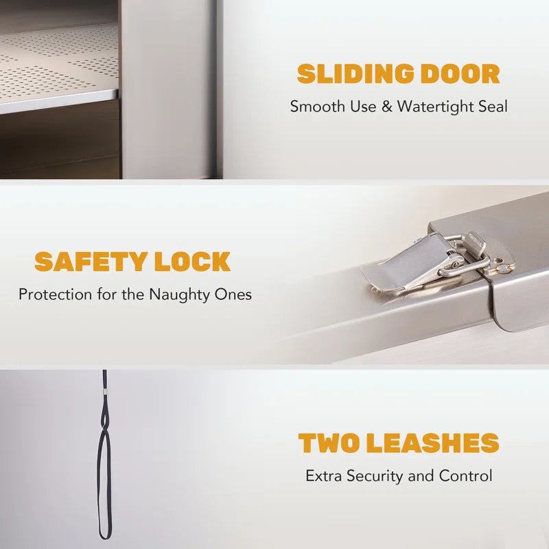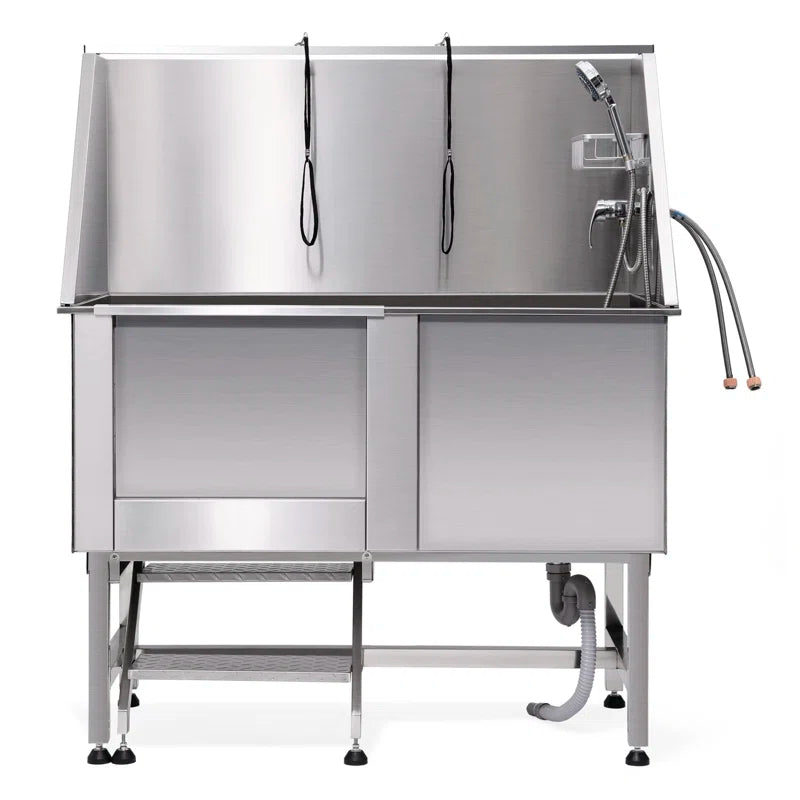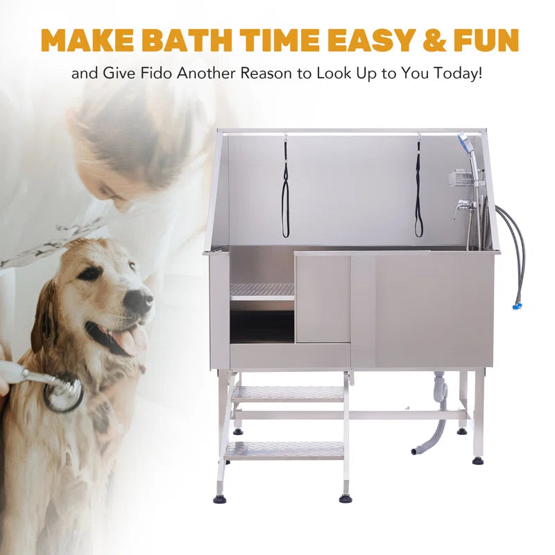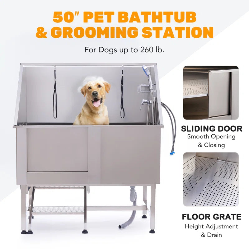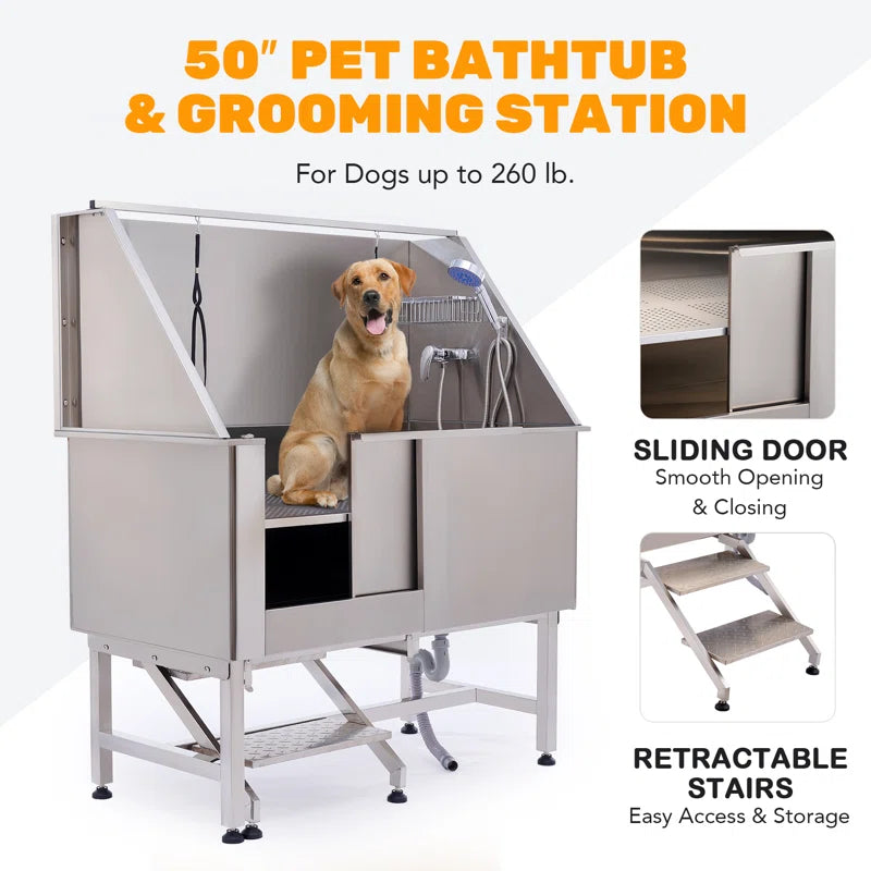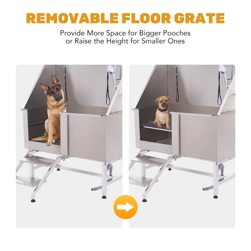 - Comfortable for You: Our 50" x 28" x 58" dog bathing station has everything you could ask for back-relieving raised tub, easy-to-clean stainless steel construction, floor-friendly & stabilizing rubber feet, odor-catching S-trap drainage, a helpful fur trap that keeps your pipes clear; and a retractable steps design for unobstructed cleaning.