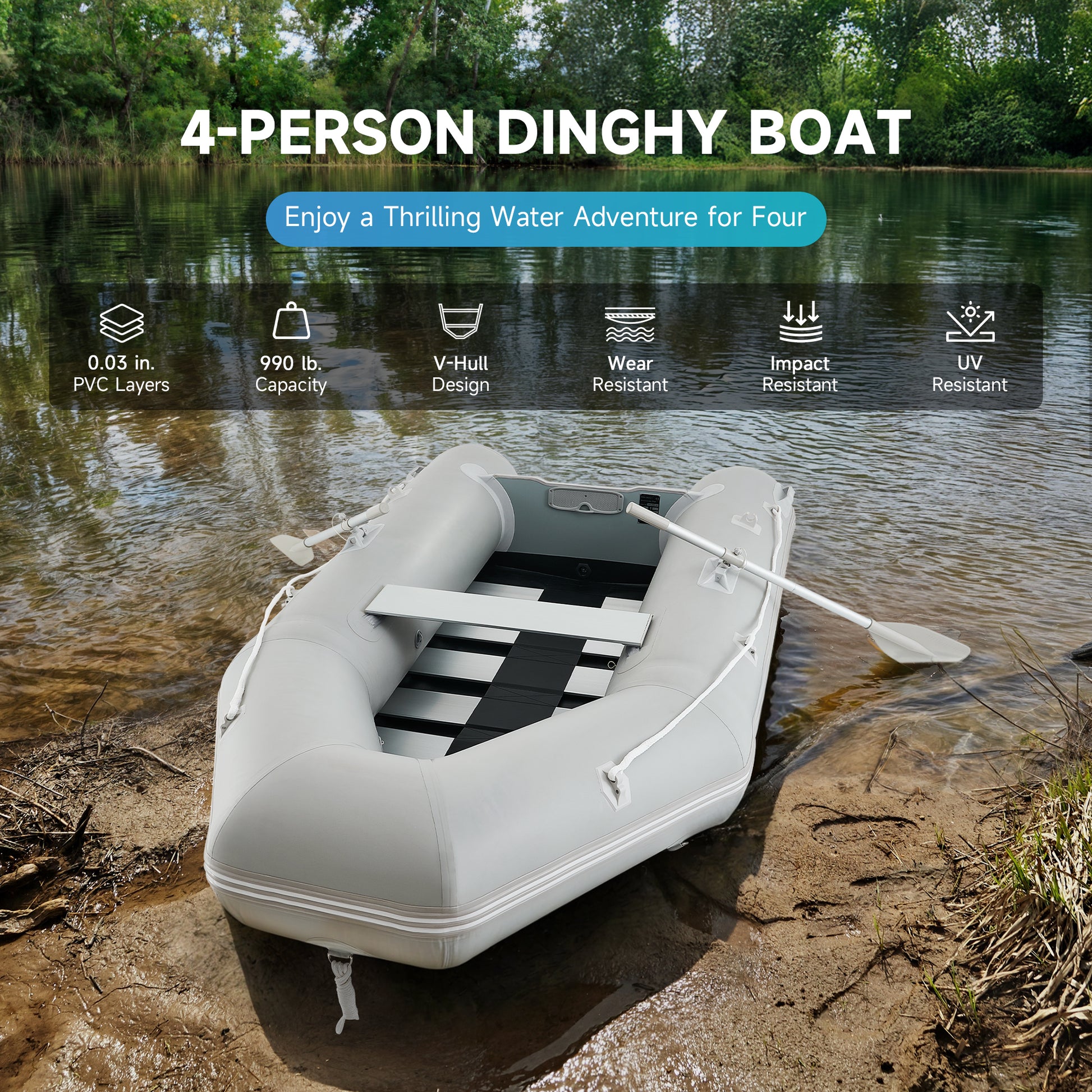 Get out and explore the great outdoors with this inflatable boat! Whether you're boating, fishing, or simply enjoying the water, this boat offers endless fun. Relax on a calm lake, float down a river, or conquer white-water rapids with family and friends. Designed to comfortably accommodate up to four people, this inflatable dinghy has a weight capacity of 990 lb. Its reinforced 1000-Denier PVC hull is highly resistant to tears and punctures, and three separate air chambers ensure that even in a worst-case scenario, you'll be able to safely reach shore. The aluminum alloy floor panels provide secure footing in calm waters, while the ultralight aluminum oars with 360° swivel mounts make paddling effortless. Plus, transportation and inflation are made easy with the included carrying bag and large foot pump.