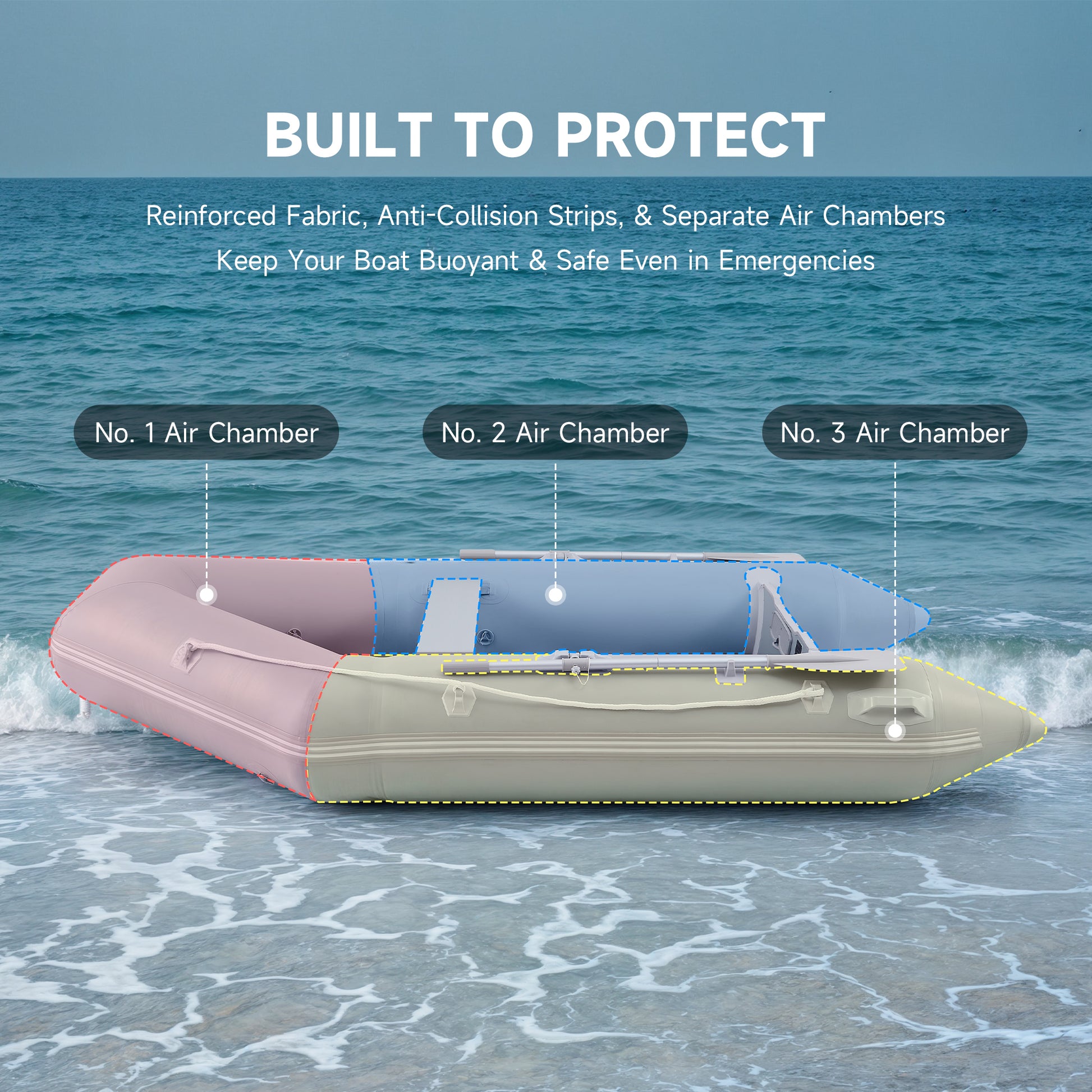 Safe Rides: With three air chambers, our dinghy maintains reliable buoyancy even in the event of a puncture. The V-shaped hull ensures stable acceleration and cornering to prevent rollovers, while the anti-collision strips around the raft offer extra protection