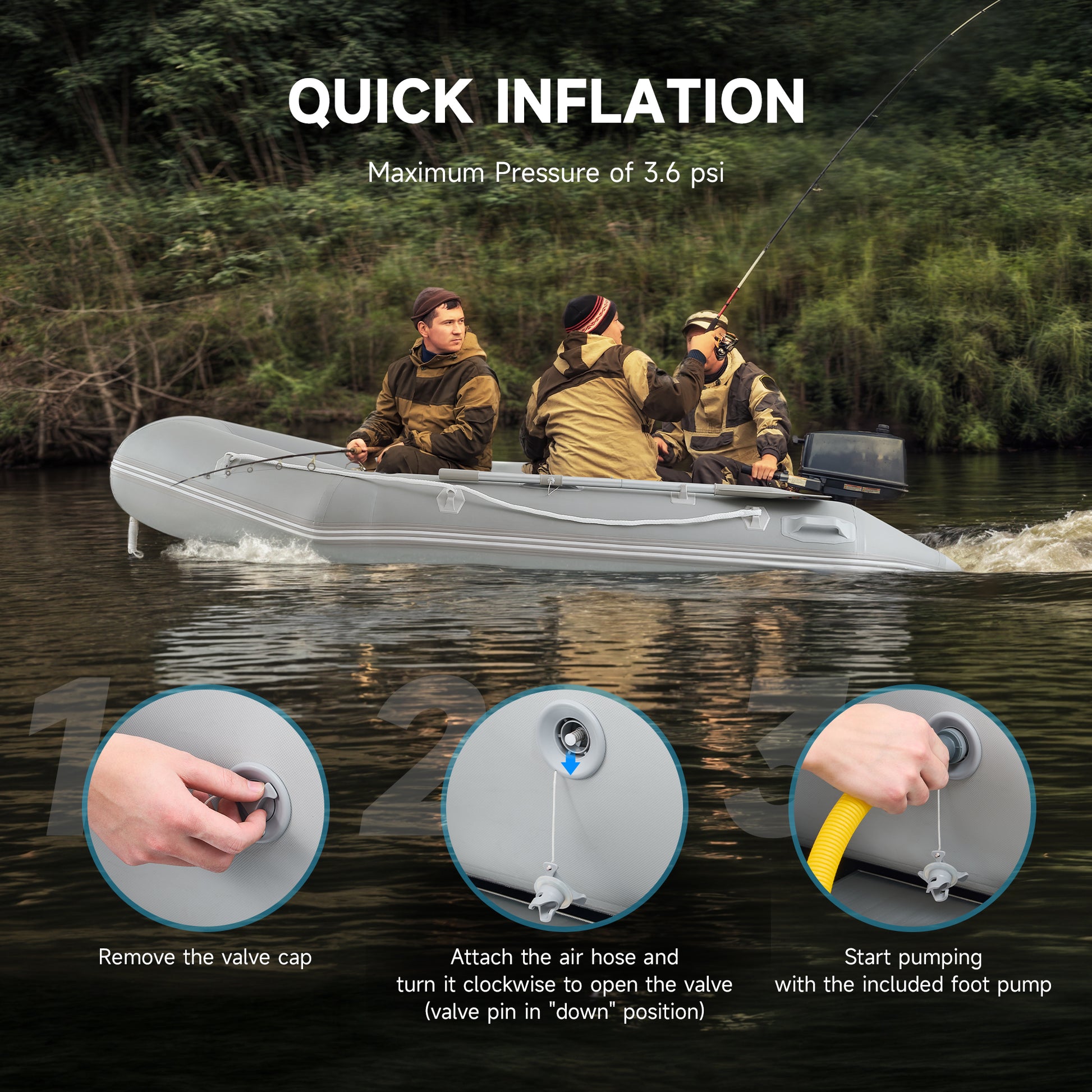 Built Tough for Any Adventure: This 10 ft inflatable boat is crafted from durable 1000 Denier PVC and reinforced with quadruple-overlap seams, providing exceptional strength and protection against wear, oxidation, punctures, and UV damage