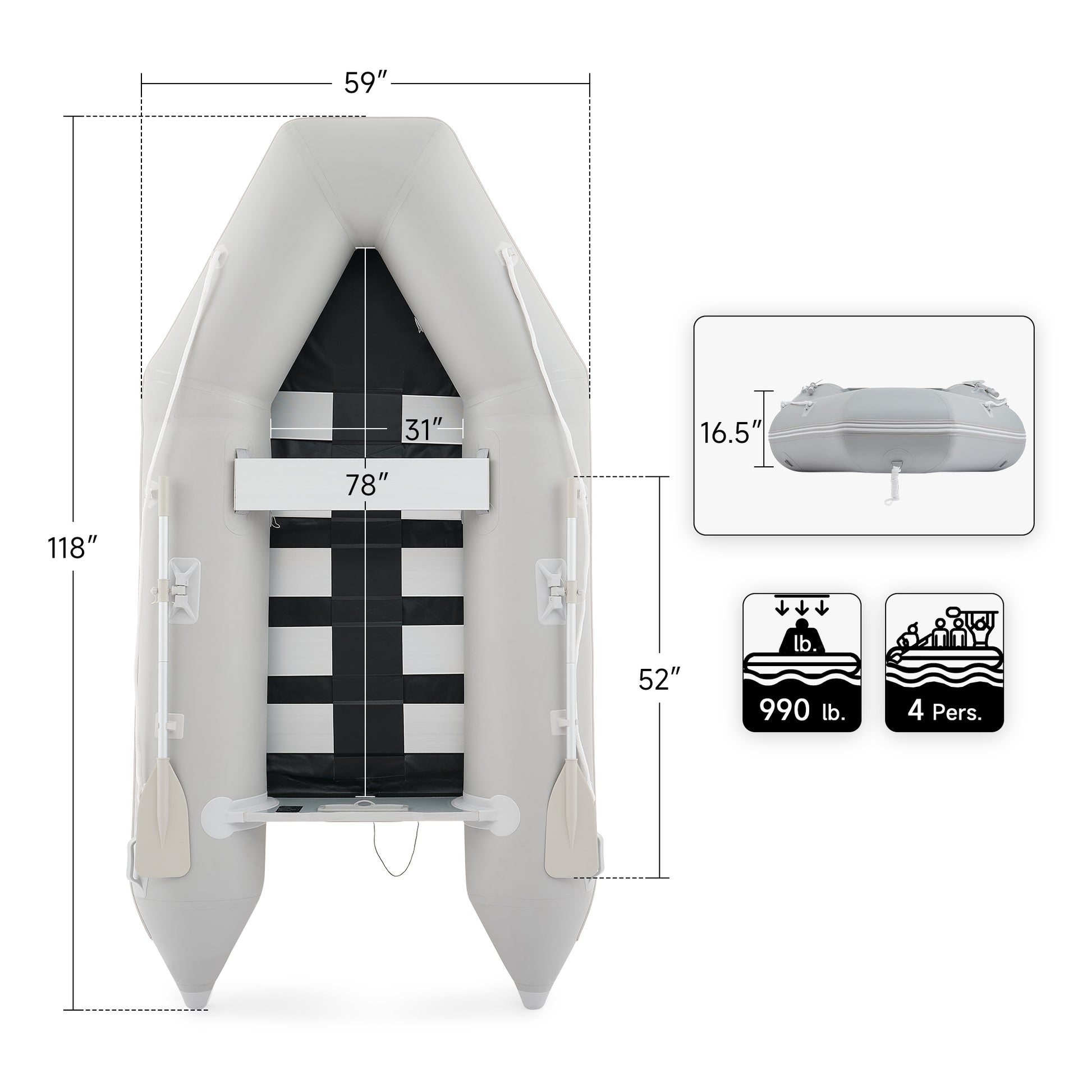 4-Person Fun: With a weight capacity of 990 lb, this 118" x 59" x 16.5" inflatable dinghy comfortably fits four passengers. The corrosion-resistant aluminum alloy floorboard and seat provide added stability and comfort for a smooth ride
