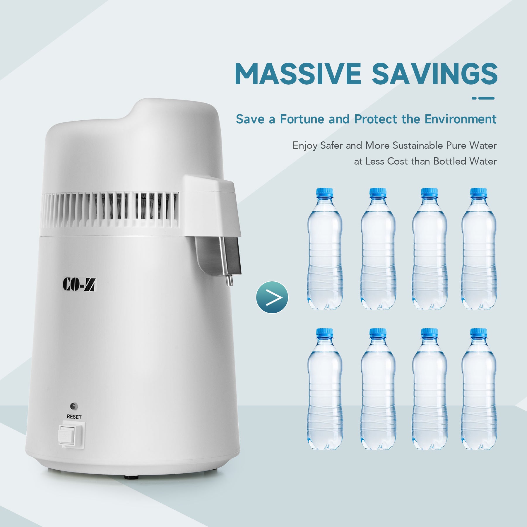 XL HOME DISTILLER: This CO-Z countertop distiller holds up to 1.6 gallons of water, which its 900W heating unit processes at nearly 0.34 gallons per hour to give you easy access to purified water in your kitchen, home office, dental clinic, or lab