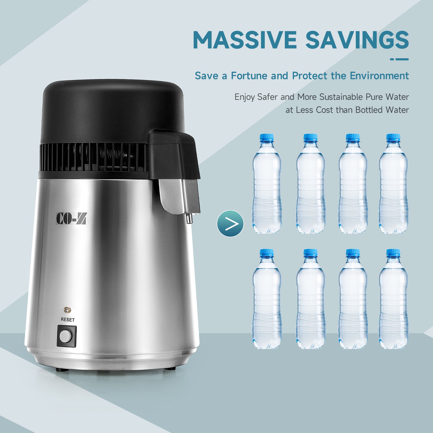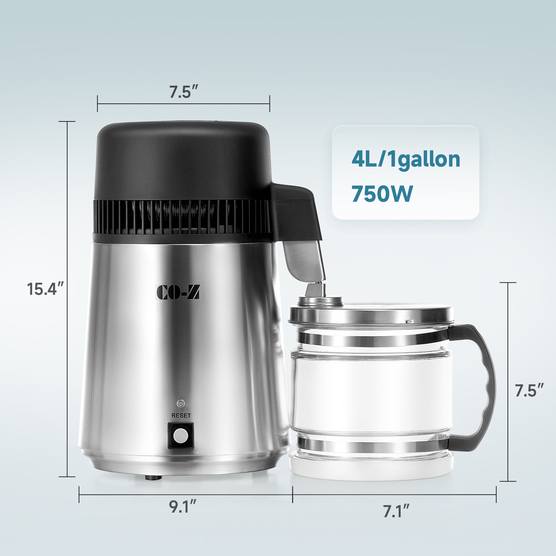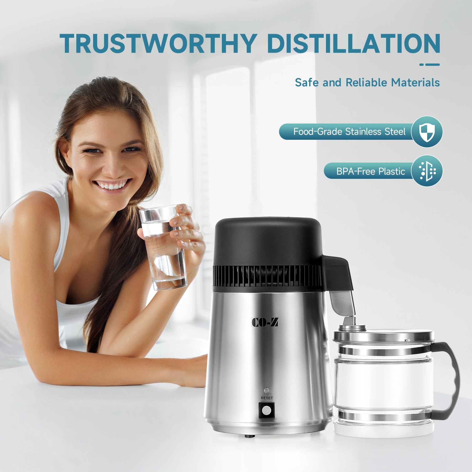 - 【WATER DISTILLER】This 750W tabletop water purifier by CO-Z purifies water, filters out impurities, and dissolves VOCs at 0.3 gallons per hour to give you easy access to purified water in your kitchen, home office, dental clinic, or lab
