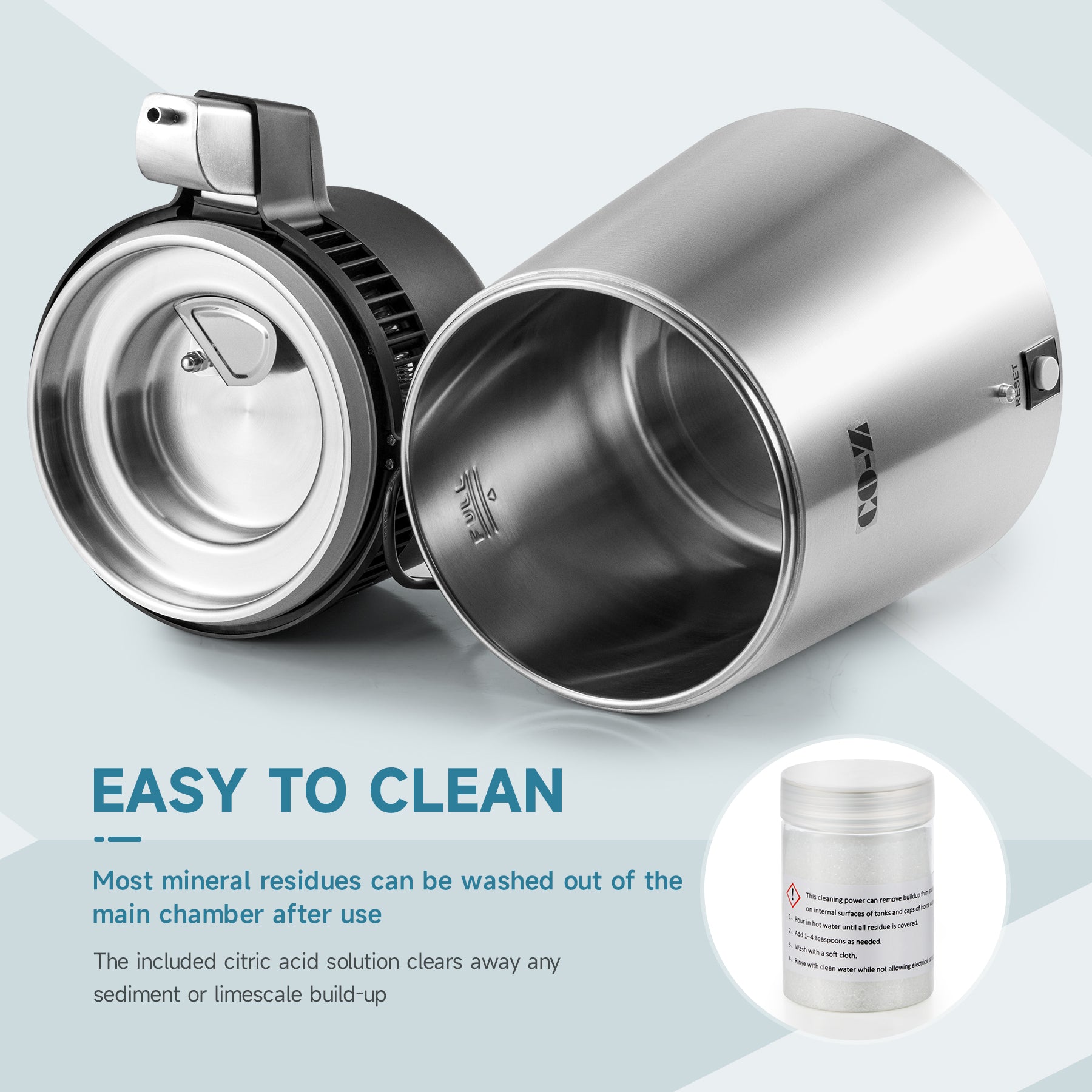- 【MAINTENANCE】The included cleaning powder allows you to easily remove any sediment or scale buildup, At the end of distillation, leaving some water at the bottom can effectively reduce scale